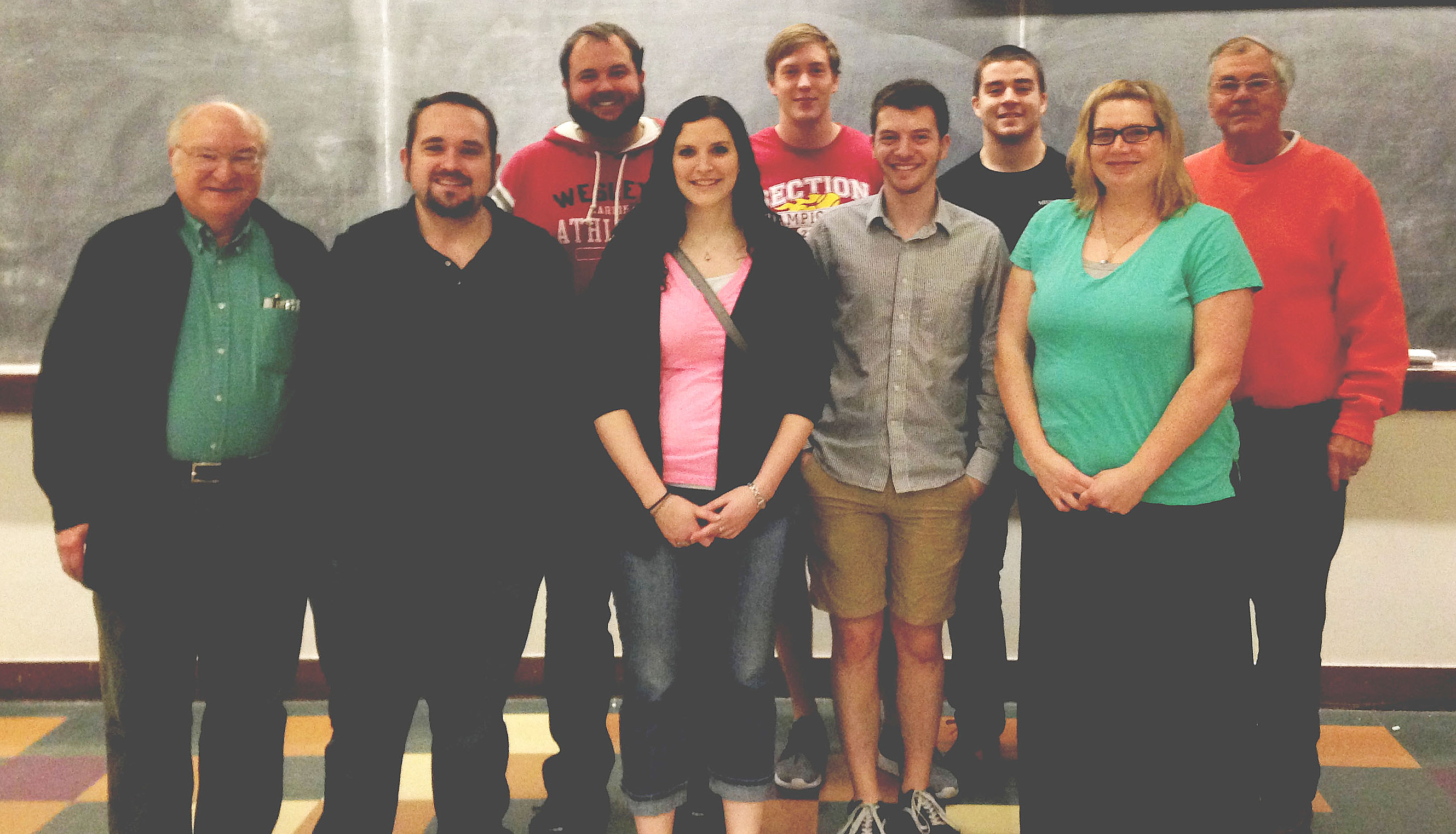 We have a standing collaboration with Prof. Stew Novick (far left) and Prof. Emeritus Pete Pringle (far right) of the Department of Chemistry at Wesleyan University. Here is a photo taken of our combined groups when we visited in April of 2014 for the Undergraduate Symposium on High Resolution Spectroscopy.